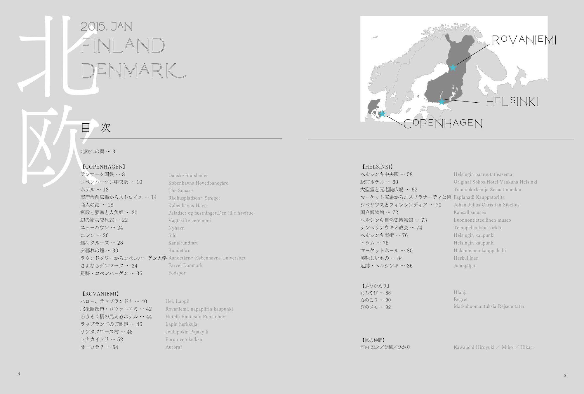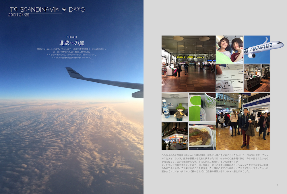 家族それぞれのスマホ、1眼レフなど5台のカメラで撮った写真は、1週間で7000枚を超えました。データの状態では振り返ることも難しかったので、1冊の本にまとめることに。 訪れた場所1ヶ所を1見開きと決め、行程表をもとに先に目次を作成しました。